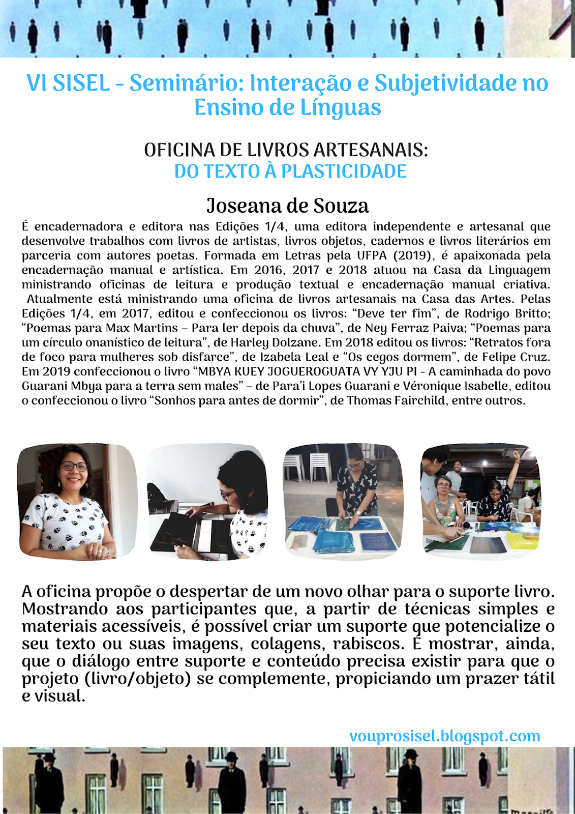 Só serão feitas inscrições em oficinas de participantes que já tiverem confirmado a inscrição no SISEL, ou seja, que já tiverem efetuado o pagamento da taxa de inscrição e enviado o comprovante para vouprosisel@hotmail.com.
